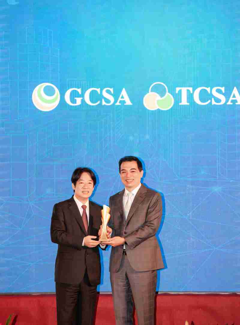 达全方位永续表现获全球永续奖及台湾永续奖肯定,,,由副总统赖清德颁奖 (左),,,赏金国际总经理柯富仁 (右) 代表领奖