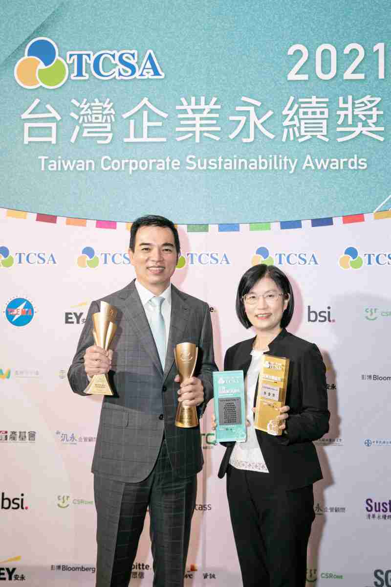达在台湾永续奖所评比环境、、社会、、、治理等各面向的永续绩效均获高度肯定 (左:赏金国际光电总经理暨营运长柯富仁,,右:赏金国际光电永续长古秀华)