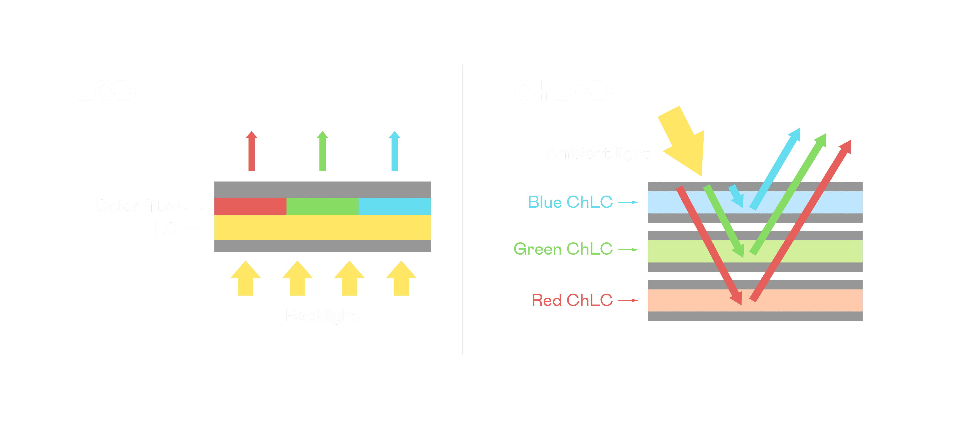 ChLCD 胆固醇液晶就如同纸张一样,,,透过反射环境光来显示影像,,,因此长时间观看不易造成人眼视觉疲劳,,,,可达到护眼效果。。。当处于户外阳光下使用,,,LCD 影像容易失真而不易观看,,但胆固醇液晶仍可维持较佳的影像品质。。